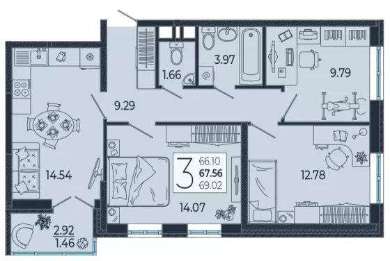 Продается 3-х комн. новостройка, 68.05 кв.м., 16/21 эт