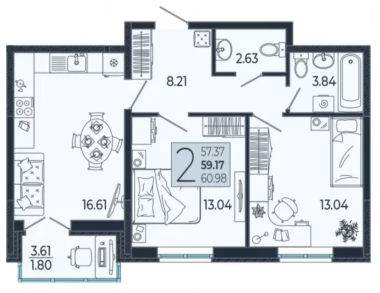 Продается 2-х комн. новостройка, 59 кв.м., 4/21 эт