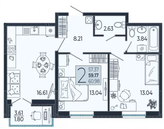 Продается 2-х комн. новостройка, 59.2 кв.м., 20/21 эт