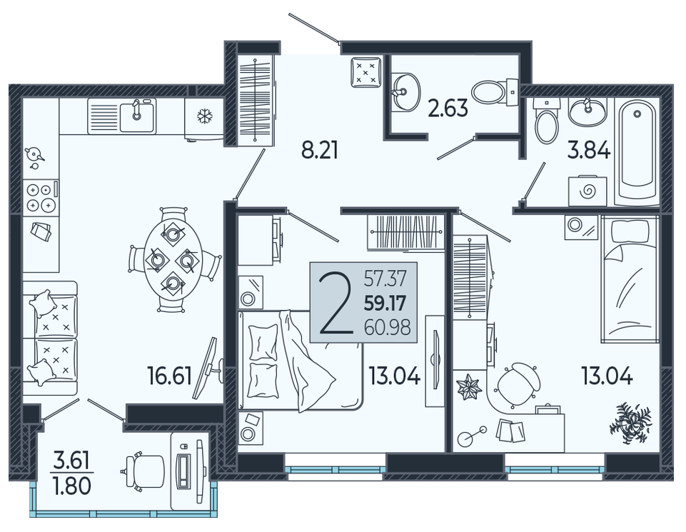 Продается 2-х комн. новостройка, 59.2 кв.м., 10/21 эт