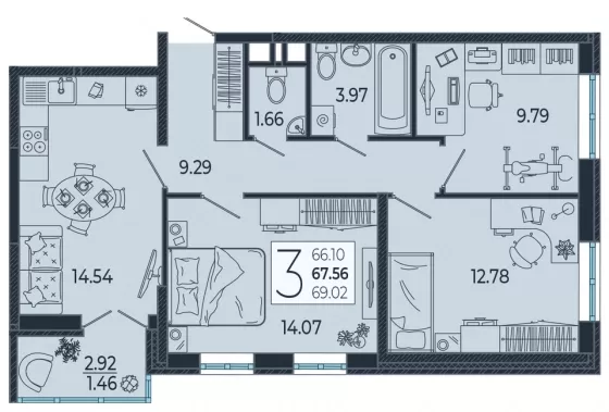 Продается 3-х комн. новостройка, 68.1 кв.м., 2/21 эт