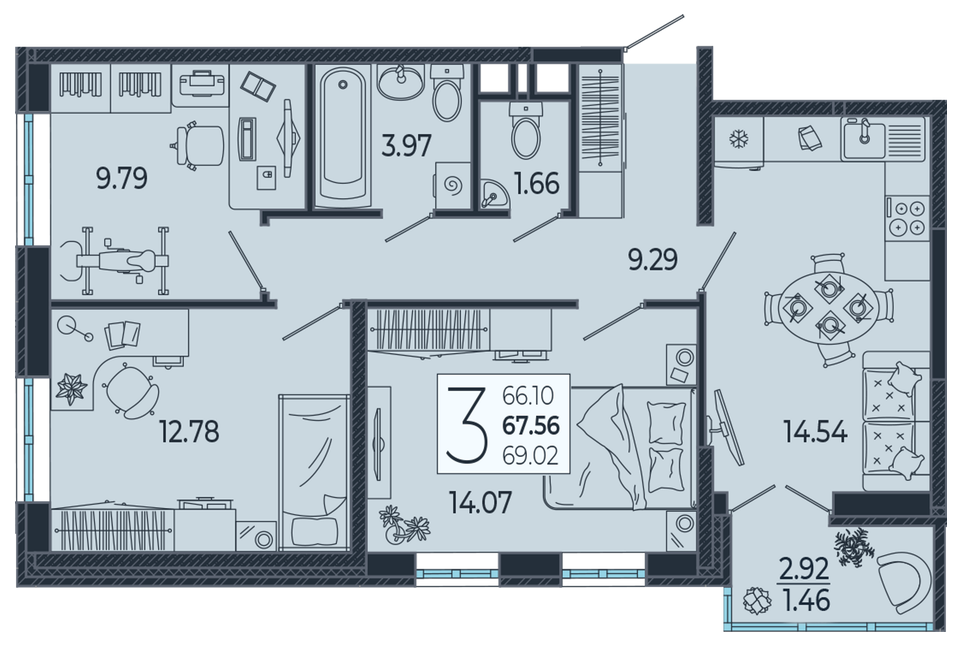 Продается 3-х комн. новостройка, 68 кв.м., 3/21 эт