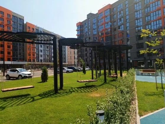 Придомовая территория с ландшафтным дизайном разделена местами для отдыха, безопасные детские площадки с тренажерами, зонами воркаута с тренажерами и турниками, баскетбольная арт- площадка.