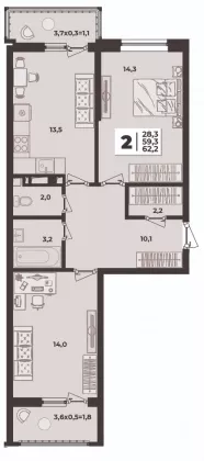 Продается 2-х комн. новостройка, 62.2 кв.м., 8/9 эт