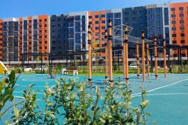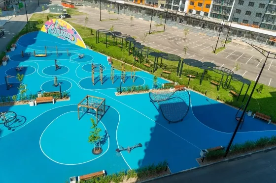 Придомовая территория с ландшафтным дизайном разделена на безопасные детские площадки с тренажерами, зонами воркаута с тренажерами и турниками, баскетбольная арт- площадка и местами для отдыха.