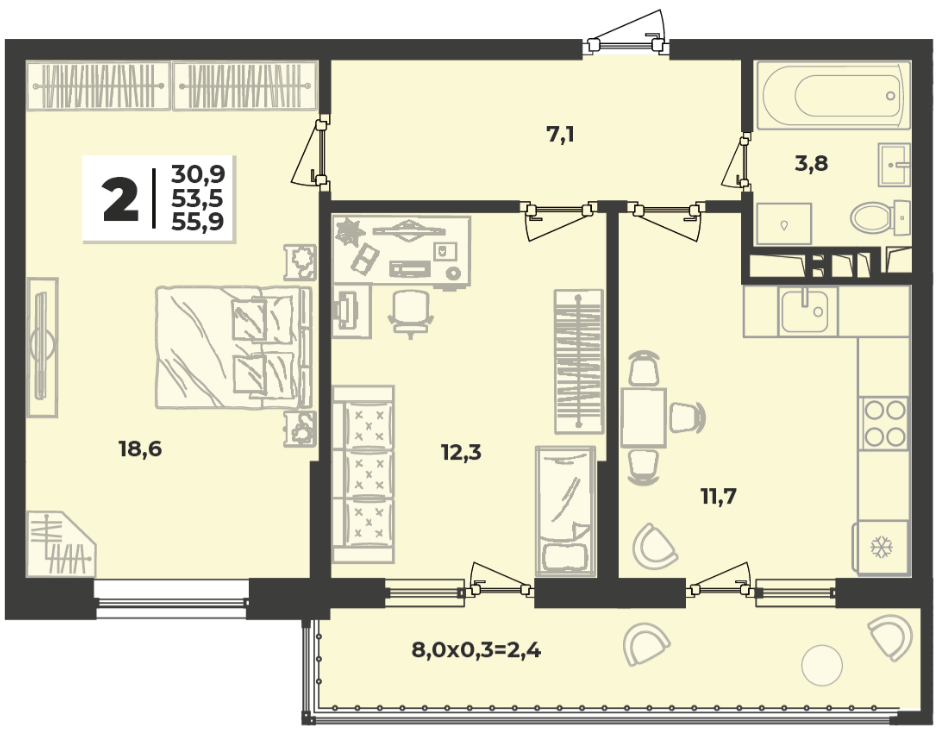 Продается 2-х комн. новостройка, 55.9 кв.м., 3/9 эт