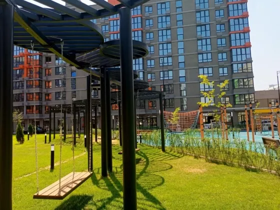 Придомовая территория с ландшафтным дизайном разделена на места для отдыха, баскетбольная арт- площадка, безопасные детские площадки с тренажерами, зонами воркаута с тренажерами и турниками.