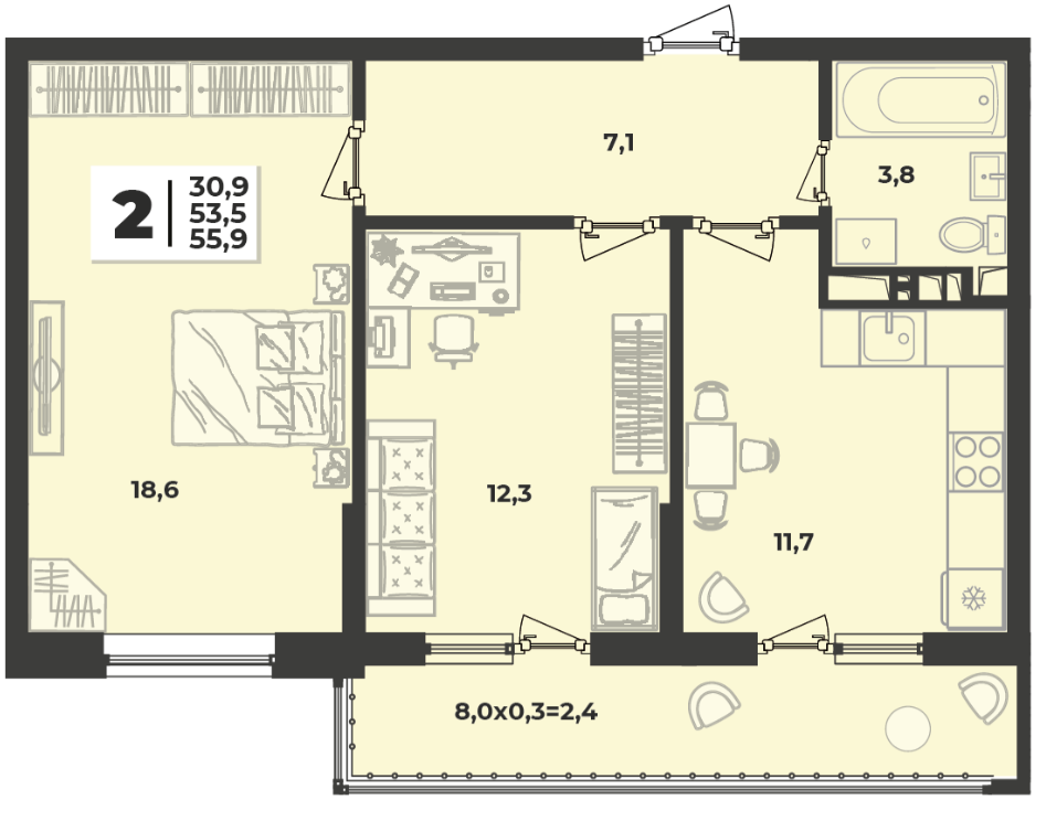 Продается 2-х комн. новостройка, 55.9 кв.м., 8/9 эт
