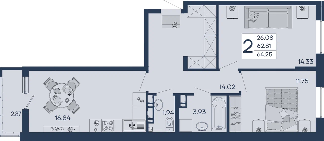 Продается 2-х комн. новостройка, 64.25 кв.м., 6/9 эт