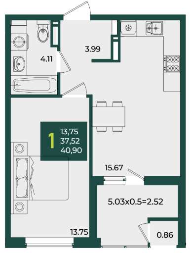 Продается однокомнатная новостройка, 40.9 кв.м., 18/18 эт