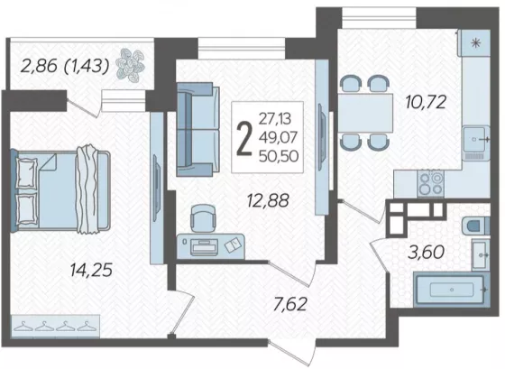 Продается 2-х комн. новостройка, 50.5 кв.м., 12/16 эт