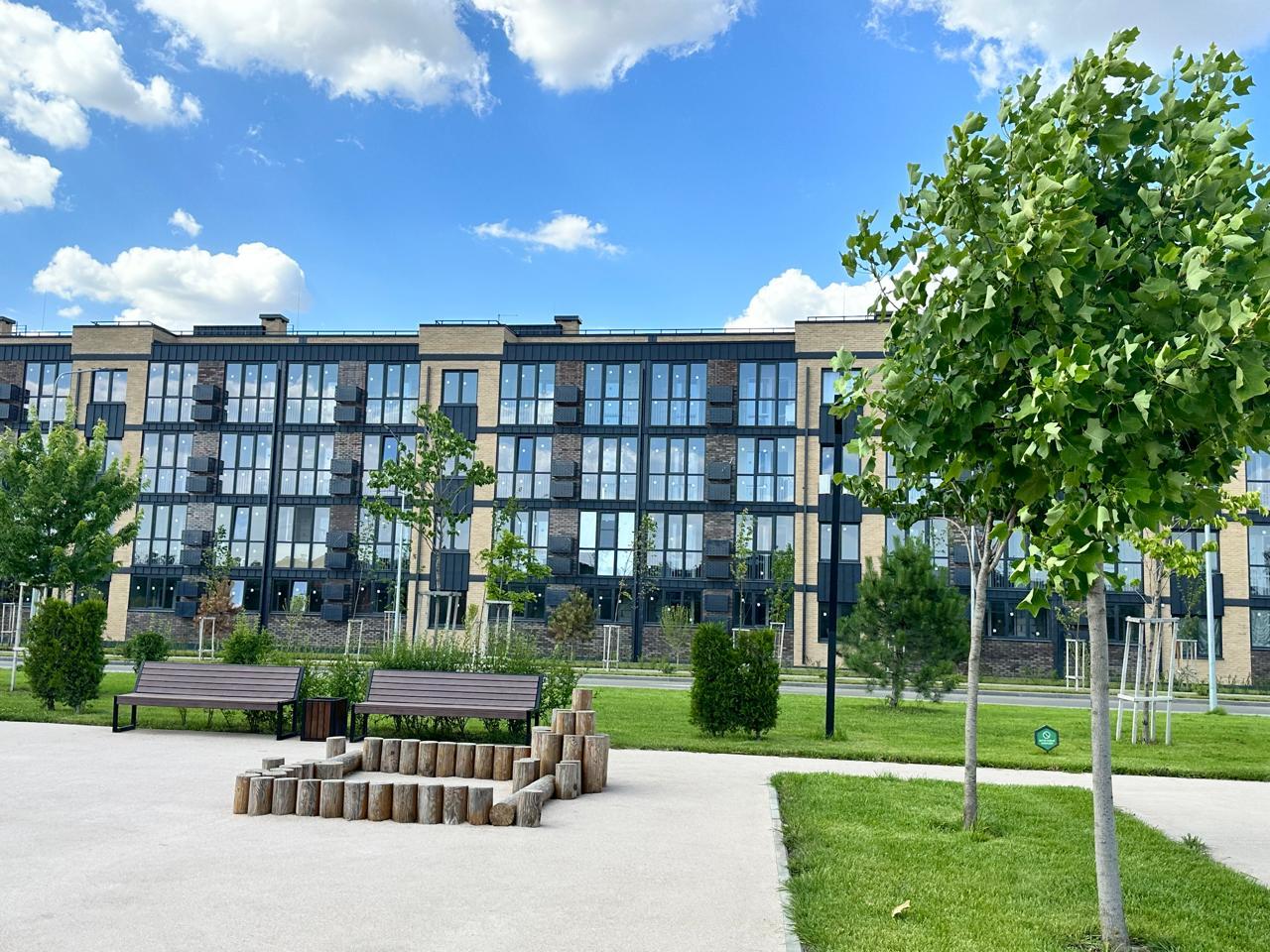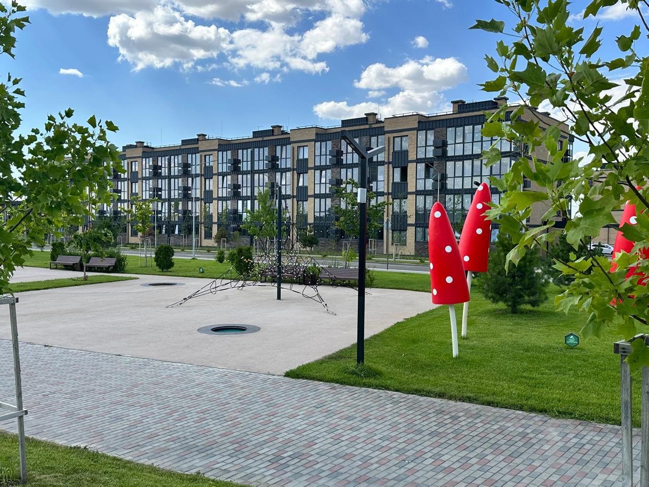 Для жителей многоквартирных домов предусмотрены дворы-стилобаты. На первом этаже- гостевые и персональные крытые парковки. На верхнем этаже зоны отдыха- детские и спортивные площадки, зоны барбекю и прогулочные аллеи.