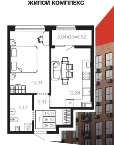 Продается однокомнатная новостройка, 38.5 кв.м., 4/9 эт