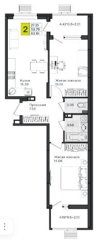 Продается 2-х комн. новостройка, 63.1 кв.м., 4/8 эт