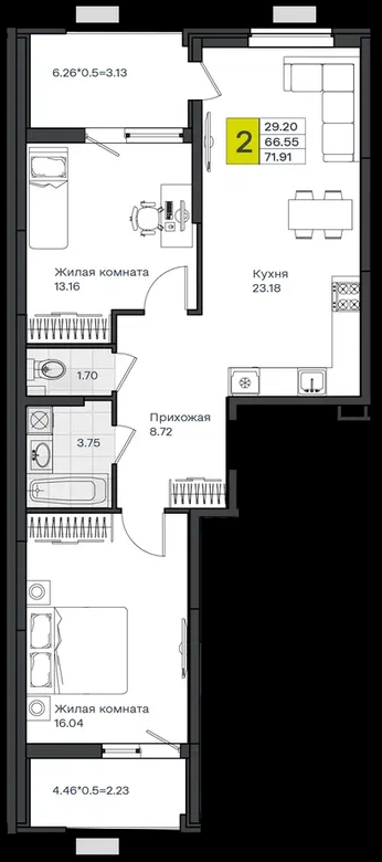 2-х комнатная квартира с большой кухней- гостиной 23,18 и двумя лоджиями !