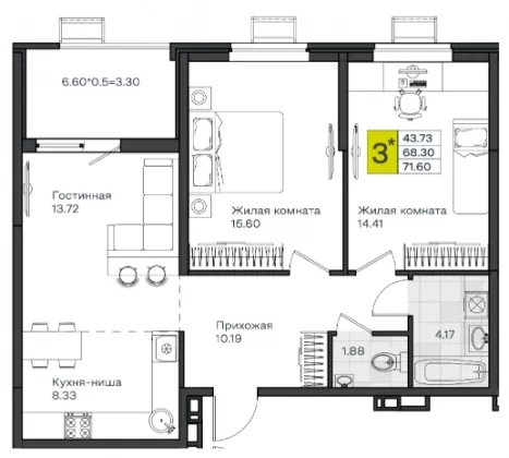 Продается 2-х комн. новостройка, 71.6 кв.м., 8/8 эт
