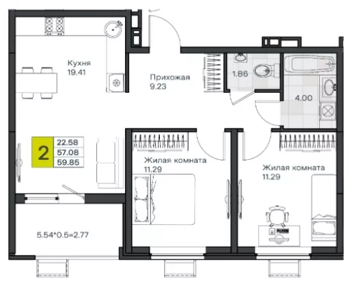 Продается 2-х комн. новостройка, 59.85 кв.м., 7/8 эт