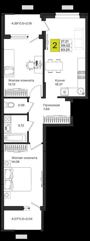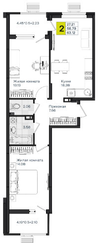 Двухкомнатная квартира с просторной кухней- гостиной 18,39 м2 с двумя просторными лоджиями!!!