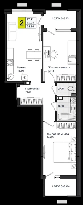 Двухкомнатная квартира с просторной кухней- гостиной 18,39 м2 с двумя просторными лоджиями!!!