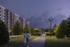Собственный сквер, детские игровые площадки с безопасным покрытием, велодорожки 796 метров, городской парк «Сосновый».