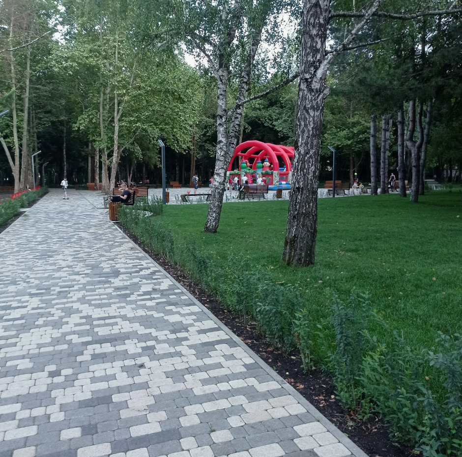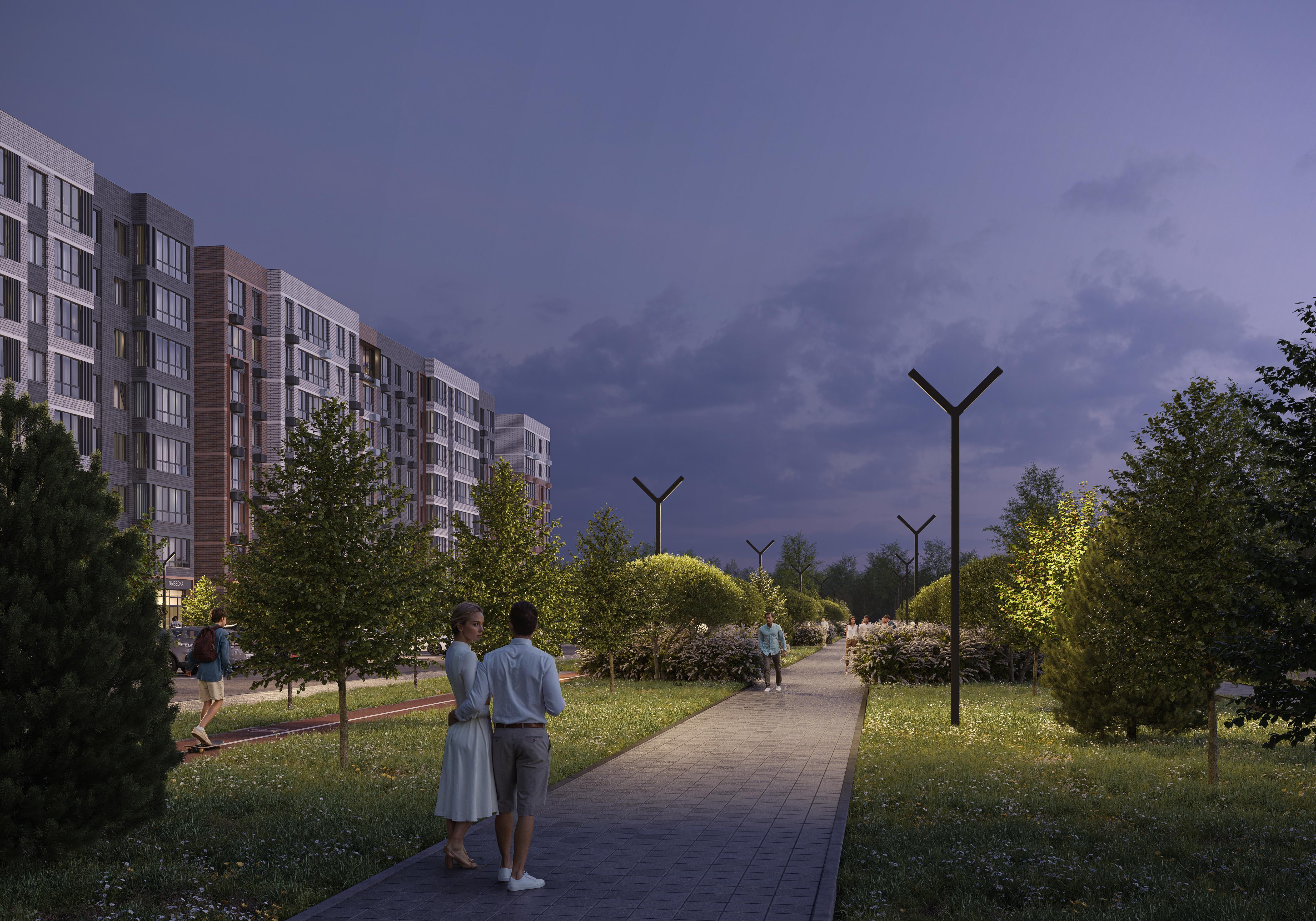Собственный сквер, детские игровые площадки с безопасным покрытием, велодорожки 796 метров, городской парк «Сосновый».