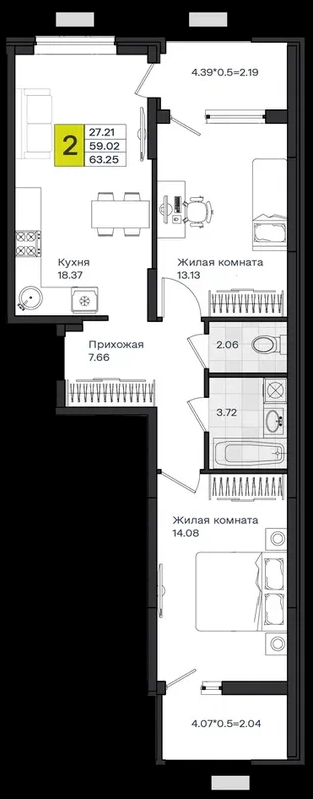 Продается 2-х комн. новостройка, 63.37 кв.м., 2/8 эт