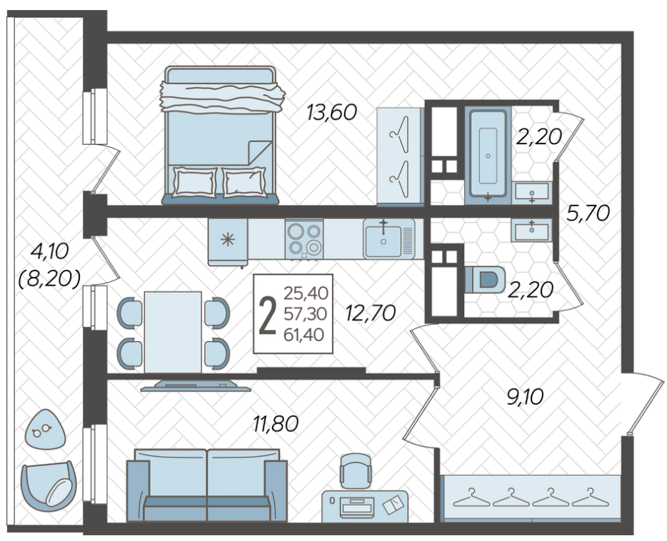 Продается 2-х комн. новостройка, 61.1 кв.м., 8/16 эт