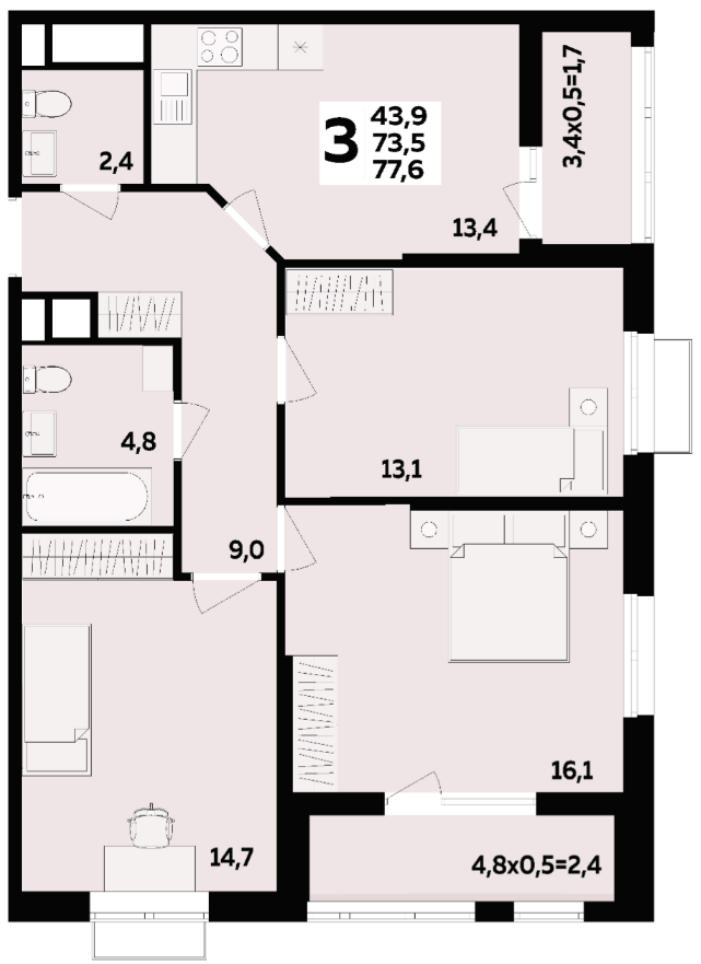 Продается 3-х комн. новостройка, 77.6 кв.м., 14/16 эт