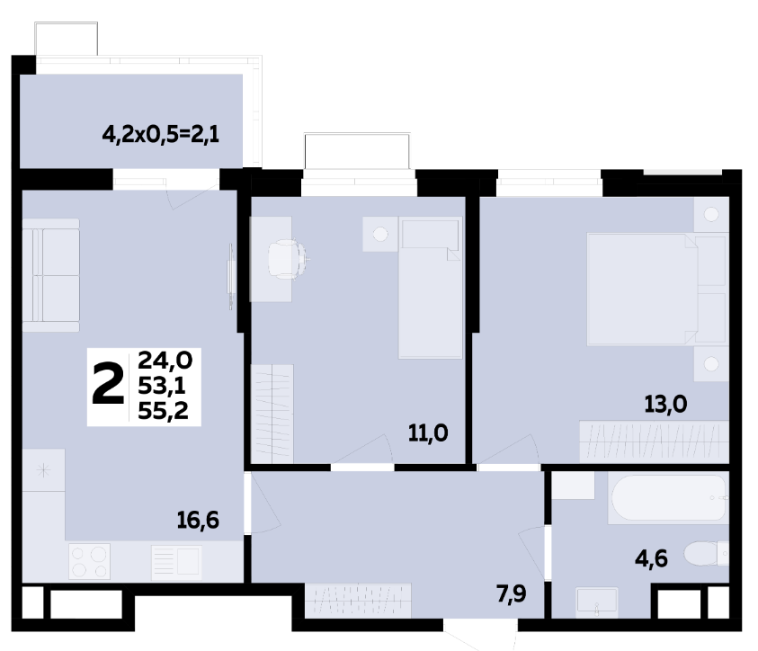 Продается 2-х комн. новостройка, 55.2 кв.м., 4/16 эт
