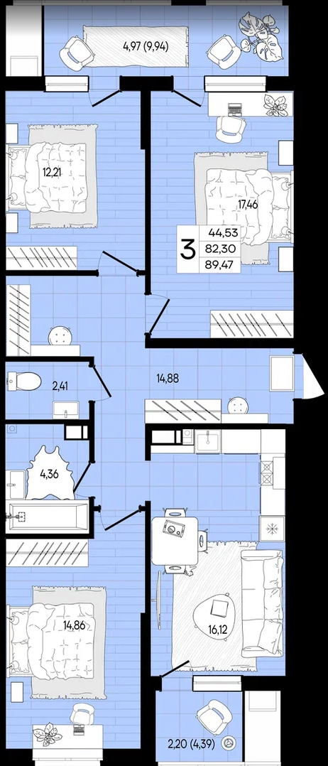 Продается 3-х комн. новостройка, 89.47 кв.м., 4/9 эт