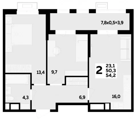 Двухкомнатная квартира с большой лоджией 7,8 м2!