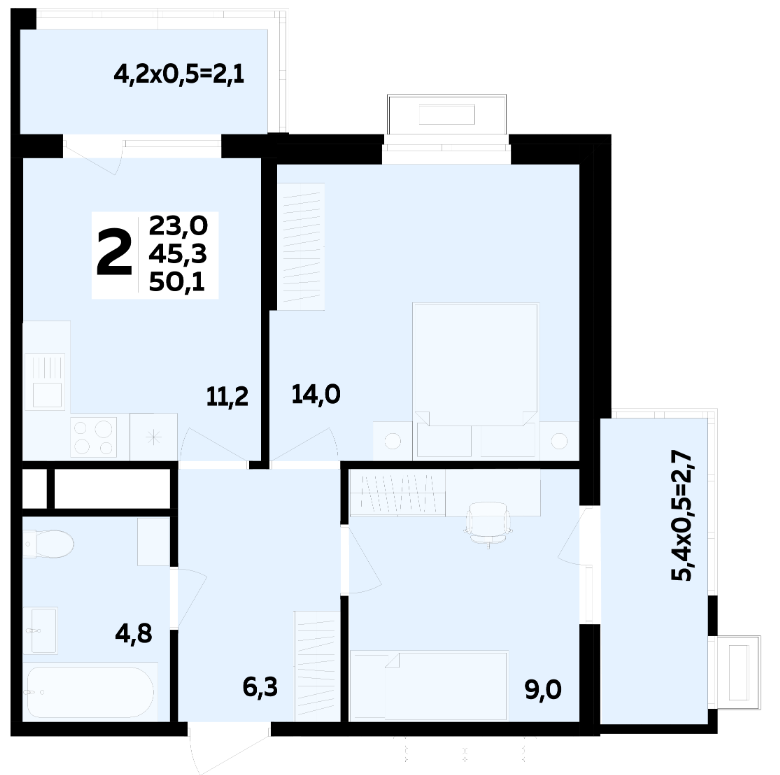 Продается 2-х комн. новостройка, 50.1 кв.м., 11/16 эт