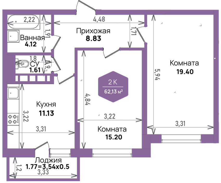 Продается 2-х комн. новостройка, 62.13 кв.м., 5/24 эт