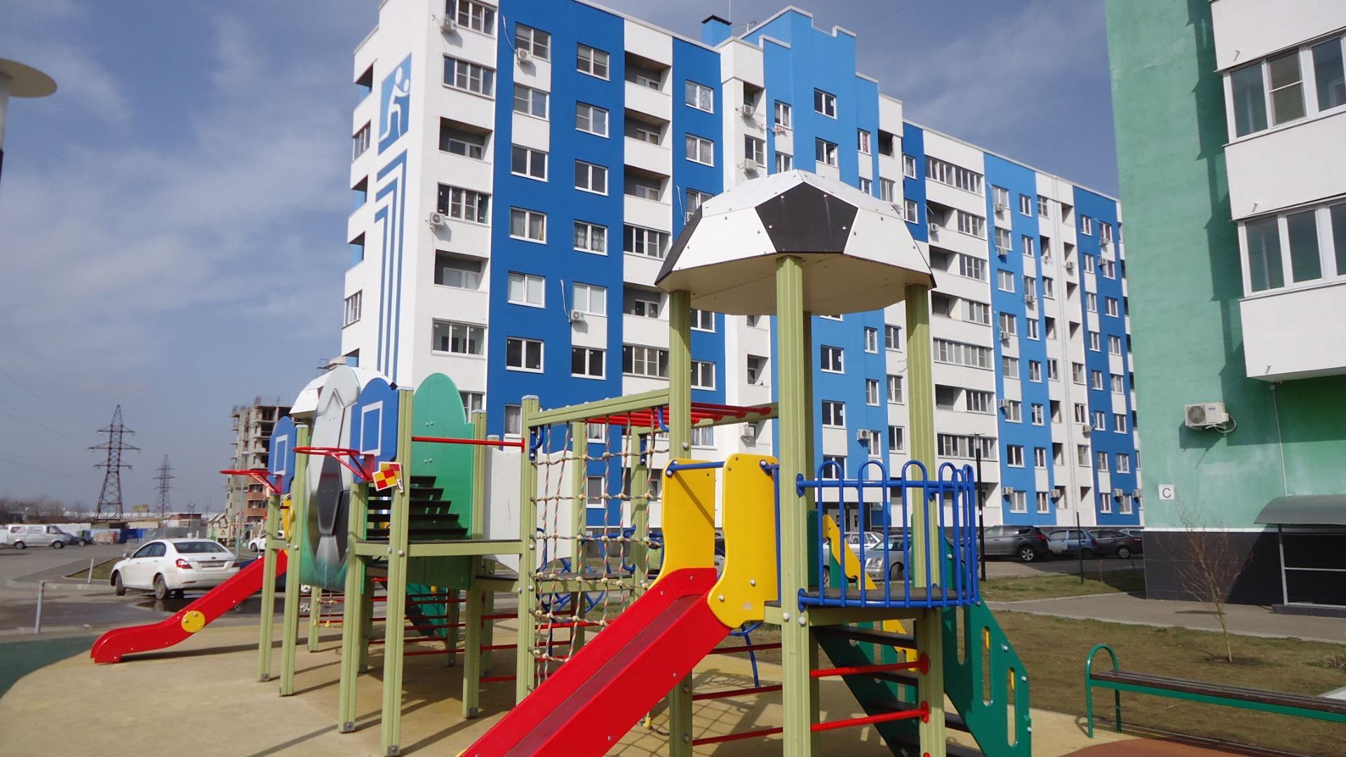 Благоустроенная придомовая территория, красочно оформлены детские и спортивные площадки в спортивном стиле, кругом чисто и порядок