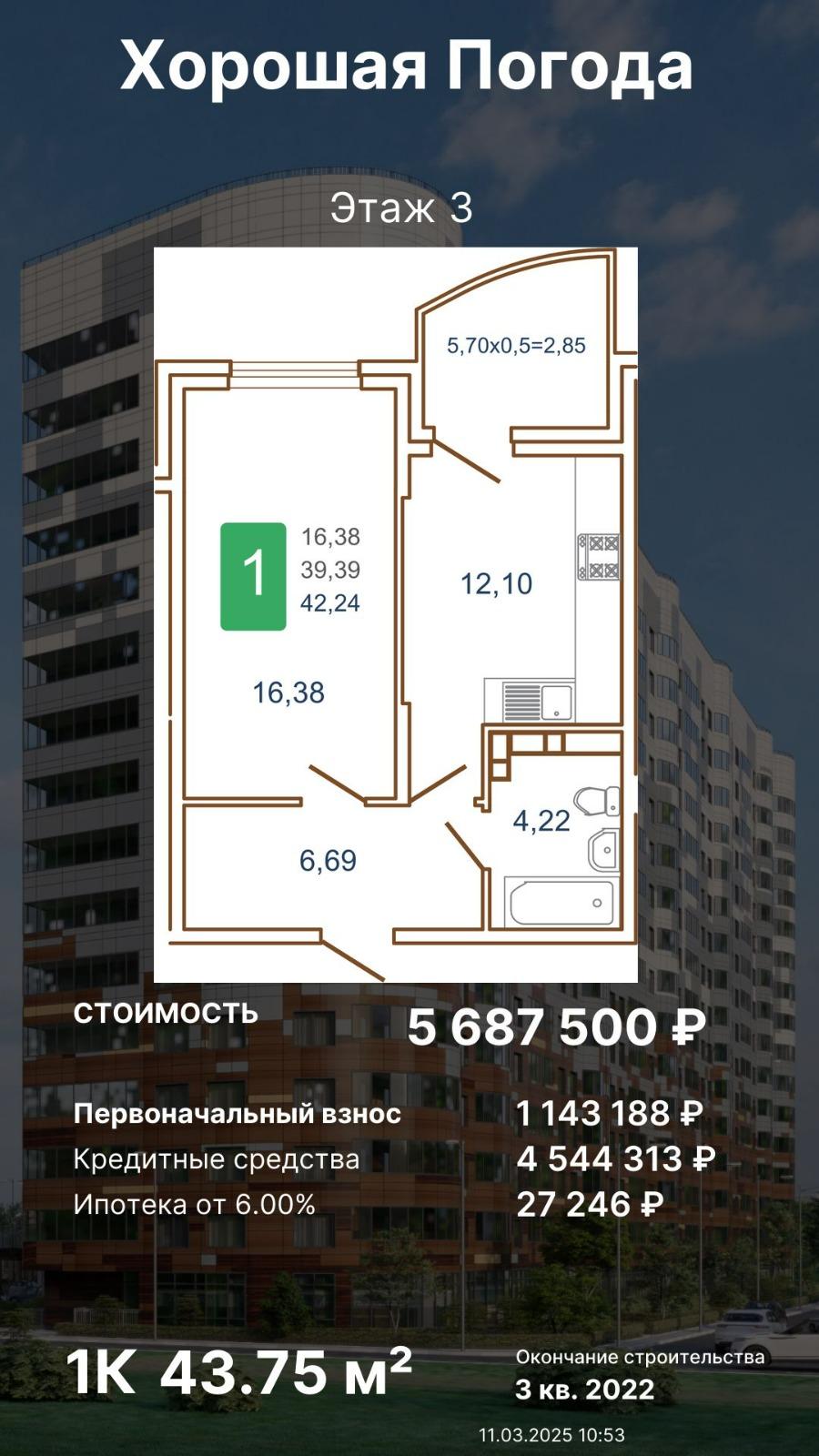 Продается однокомнатная новостройка, 42.24 кв.м., 3/16 эт