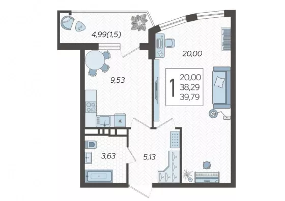 Продается однокомнатная новостройка, 39.75 кв.м., 20/21 эт