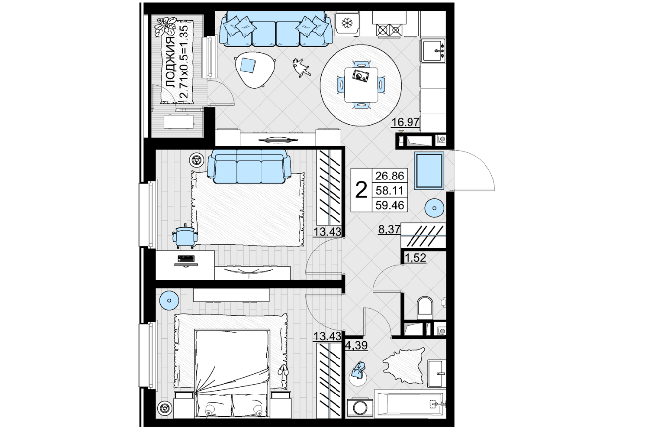 Продается 2-х комн. новостройка, 59.46 кв.м., 10/18 эт
