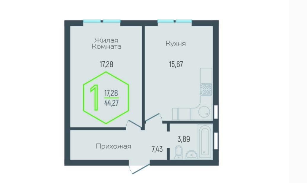 Продается однокомнатная новостройка, 44.27 кв.м., 1/3 эт