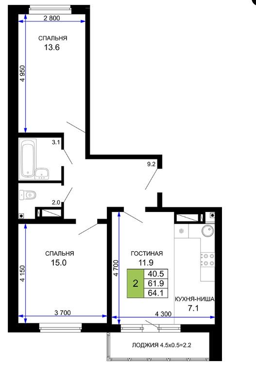 Продается 2-х комн. новостройка, 64 кв.м., 16/24 эт