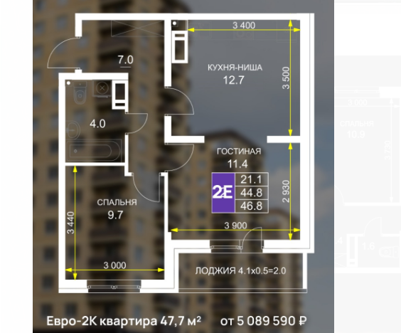 Продается 2-х комн. новостройка, 46.8 кв.м., 3/16 эт