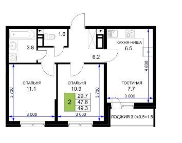 Продается 2-х комн. новостройка, 49.3 кв.м., 11/16 эт