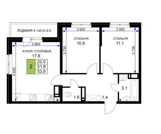 Продается 2-х комн. новостройка, 53.3 кв.м., 10/16 эт
