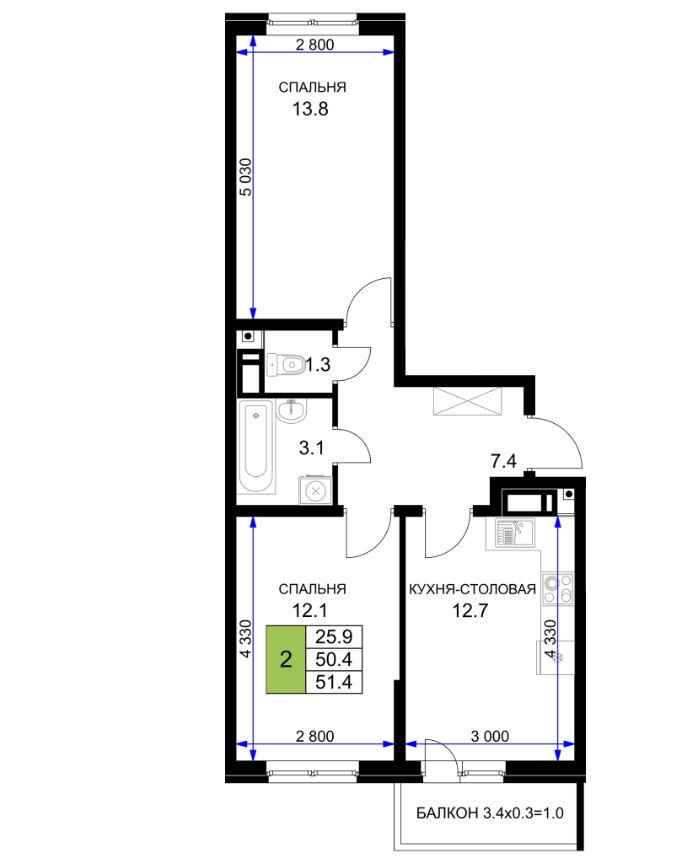 | Площадь, кв.м. | 51.4 |