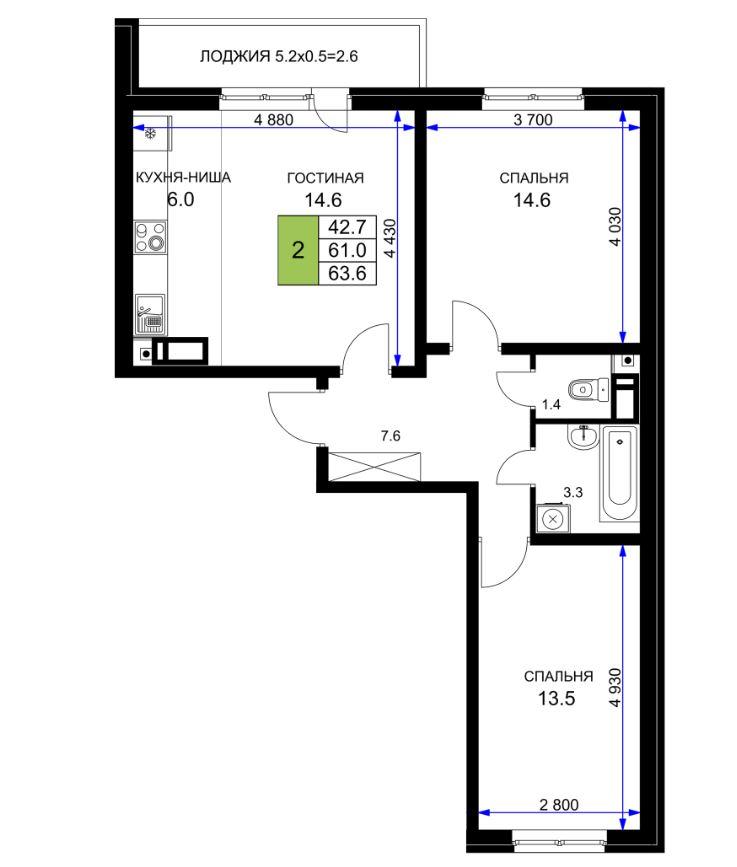 Продается 2-х комн. новостройка, 63.6 кв.м., 10/16 эт