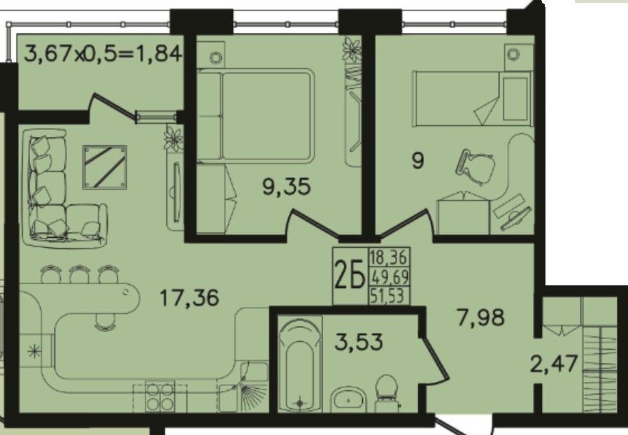 Продается 2-х комн. новостройка, 51.53 кв.м., 5/16 эт