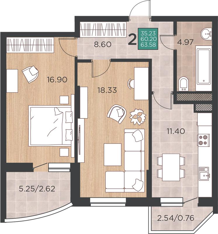 Продается 2-х комн. новостройка, 63.58 кв.м., 14/17 эт
