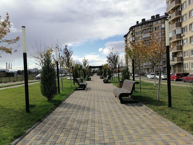 На первой линии ЖК высажен молодой яблоневый сад, красивая аллея с зонами отдыха. Много парковочных мест, двор вымощен плиткой, красочные безопасные детские площадки ограждены от проезжей части.