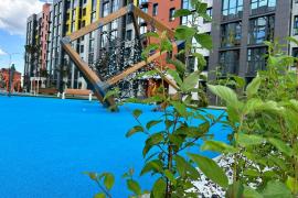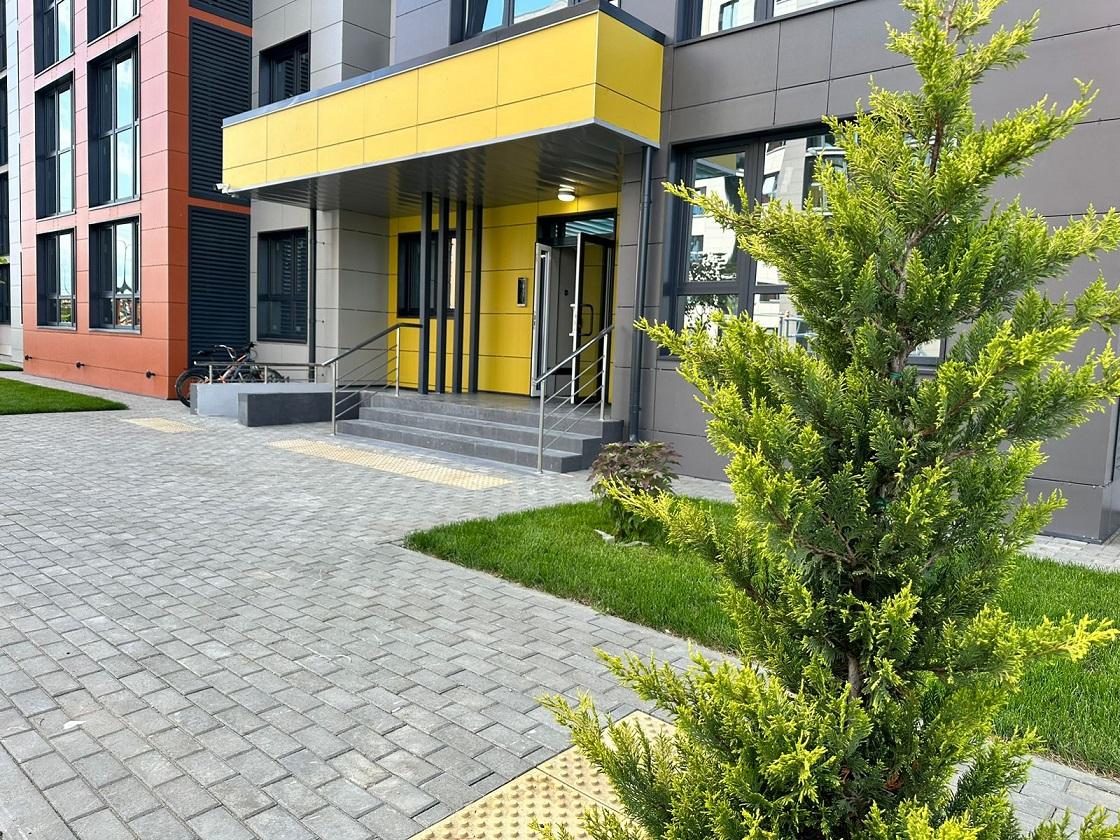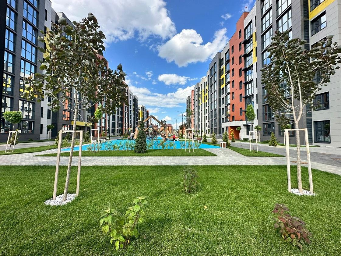 Двор без машин, закрытая благоустроеная придомовая территория, много зелени, спортивные и игровые площадки. Безопасные пешеходные зоны, велодорожки, комфортная среда.