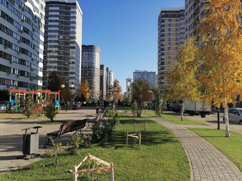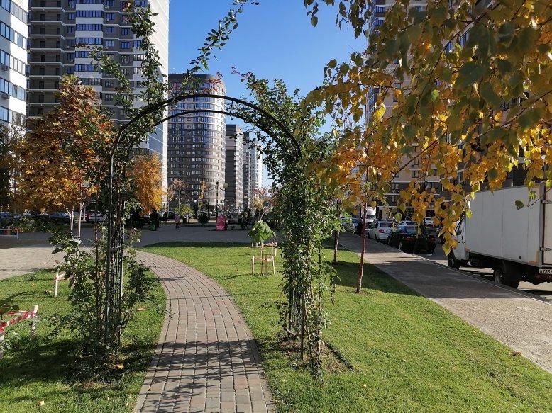 Красивые входные группы, два лифта, большая прогулочная аллея с фонтаном и с скамейками для отдыха. Много зелени кустарников и красивых деревьев. Во дворе стилобат, первый уровень стилобата это парковки для авто, второй уровень для отдыха взрослых и детей: мангальные зоны с беседками и лавками , игровые площадки футбольные и баскетбольные поля.