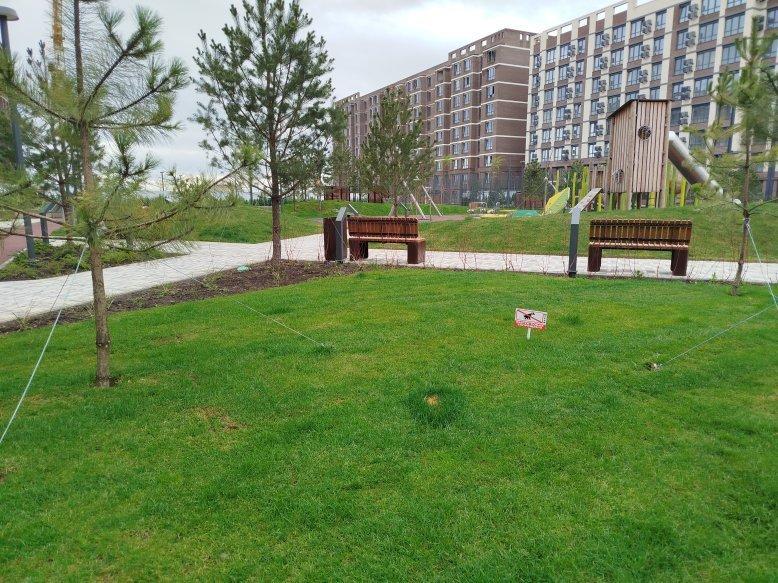 Панорамные окна, зеленными насаждения, парк из елей, цветники, ландшафтный дизайн двора, площадь парковых и прогулочных зон 2,2 гектара. В центре двора стильный фонтан, здесь же удобная зона с лежаками.